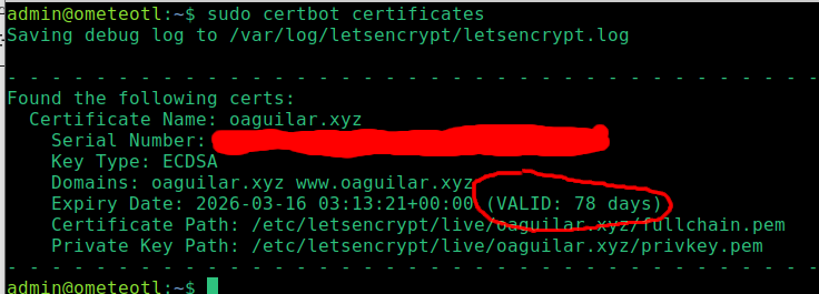 Nos informa que aun es valido por 78 días, vamos a renovarlo ya que CertBot emite certificados que solo son validos por 90 días, en mi caso la renovación la haré manualmente con el siguiente comando